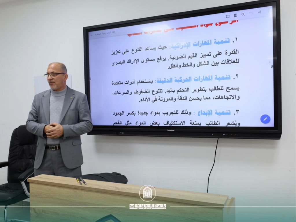 The workshop was delivered by Asst. Prof. Dr. Asaad Yahya Muslim, who highlighted the importance of diversifying materials and tools in drawing courses and their role in enhancing students’ creative and technical abilities. He also shed light on modern teaching methods that contribute to advancing both artistic and academic standards.