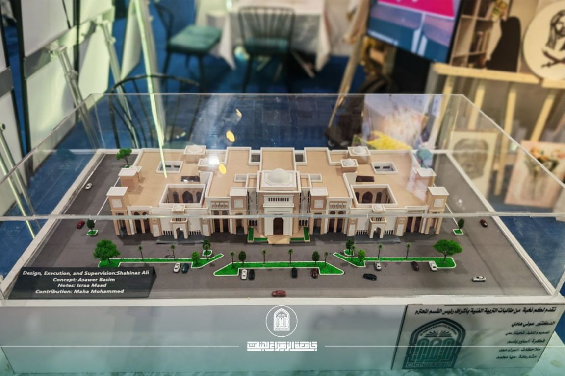 As part of the activities of the fourth edition of the Ain Al-Hayat Festival, held at the Baghdad International Fair, the Department of Art Education took part with a remarkable artistic contribution represented by the creation of a sculptural model reflecting the identity and academic-cultural mission of Al‑Zahraa University (PBUH) for Women.